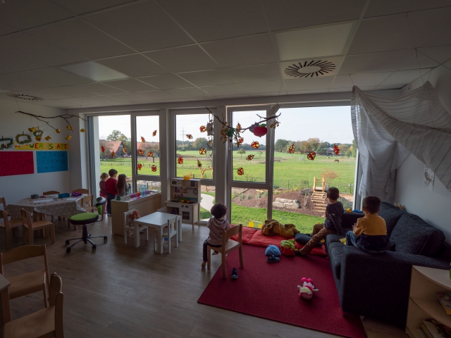 Das Spielgelände im geschützten, rückwärtigen Gebäudebereich bietet allen Altersgruppen Möglichkeiten zur Entfaltung. So gibt es beispielweise einen mit Sonnensegel beschatteten Sandkasten, eine Raupenrutsche und verschiedene Schaukeln für die Kleinsten. Eine Matschanlage mit Sandspielbereich, ein Balanciermikado, eine Hangrutsche, ein Balancierparcours mit Seilen, eine Bobbycar-Strecke sowie ein Tunnel zur „Wilden Ecke“ bieten den Kindern vielfältige Möglichkeiten zum Spielen und Toben.