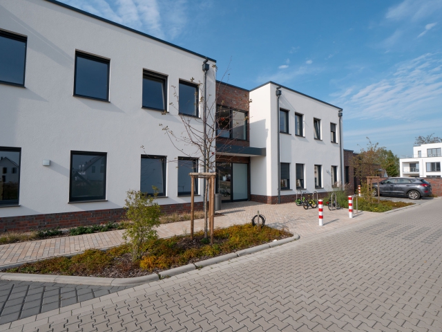 Die Zonierung der Vorplatzfläche der Kindertagesstätte in Fahr-, Stellplatz- und Wegeflächen am Eingangsbereich wird durch Pflasterbeläge in verschiedenen Formaten, Farben und Verlegemustern hergestellt. Pflanzflächen und Hecken rahmen und durchgrünen das Erscheinungsbild. Die Pkw-Stellplatzflächen für die Mitarbeiter sind bewusst von den Kurzzeit-Stellplätzen für Eltern und Betreuer zum Abholen und Bringen der Kinder separiert.