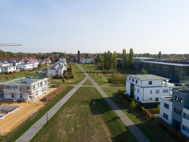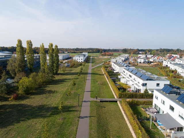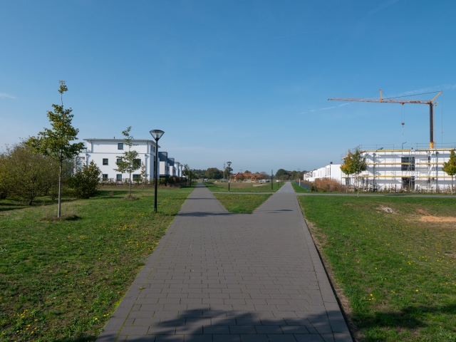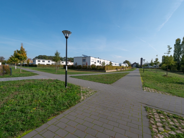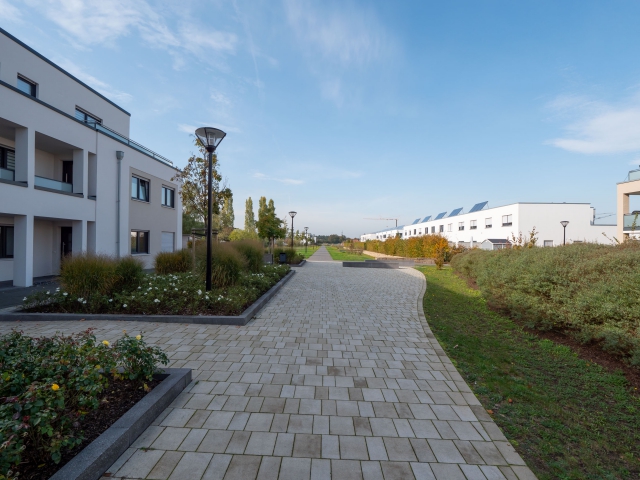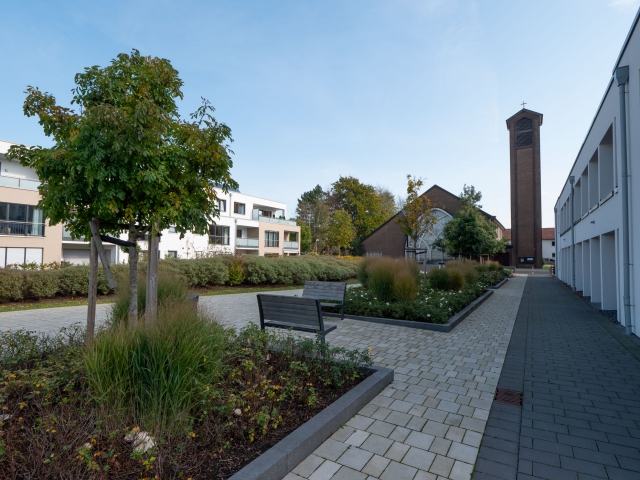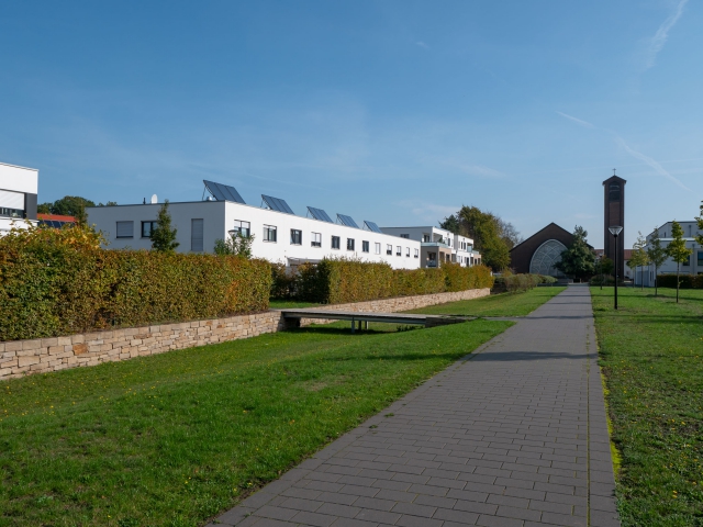Regenrückhalte- und Versickerungsflächen mit Natursteinmauern durchziehen den südlichen Bereich. Ein Steg führt als fußläufige Wegeverbindung gesäumt von Wildbirnen in das Wohngebiet hinein. Einheitliche Einfriedungen durch Hecken sorgen für ein harmonisches Gesamtbild der Wohnsiedlung.