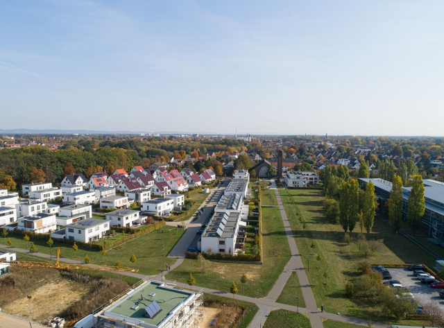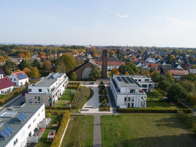 Die beiden Baugebiete zu den Bebauungsplänen Nr. 180 B und C „Auf dem Stempel“ und Nr. 285 „Auf dem Stempel / Im Fenne“ in Gütersloh-Pavenstädt sind durch übergeordnete Grünzüge miteinander verbunden. Ein durch Pflanzflächen aufgelockerter Quartiersplatz bietet mit Bänken und Sichtbetonblöcken verschiedene Sitzmöglichkeiten.